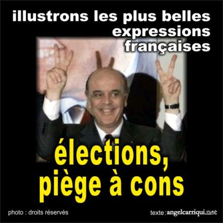 Cette entrée, publiée dans les plus belles expressions françaises, est taguée Angel Carriqui, élections, cons, expressions, humour, littérature, parodie, piège, satirique. Bookmarquez ce permalien.