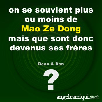 Cette entrée, publiée dans familles célèbres, est taguée Angel Carriqui, calembour, devinette, familles célèbres, humour, M & Mme, Mao Tsé Toung, Mao Zedong, ont un fils, ont une fille, ont une soeur. Bookmarquez ce permalien.